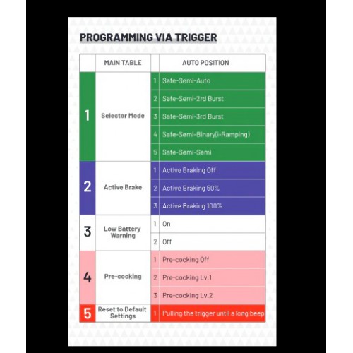 - Firing Mode: Semi Auto/ 2rd Burst (Programmable) / 3rd Burst (Programmable) / Binary (Programmable) / Full Auto / Safety
