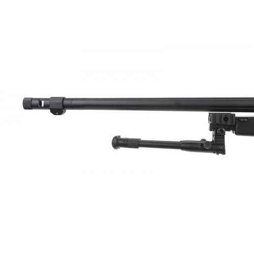 MB4414A spring-action sniper rifle replica by WELL. The internal construction is based on previous, well-known replicas from MB series. This is a bolt-action replica, which means that it needs to be reloaded every time prior to firing. The replica is made of metal and reinforced polymer. Metal parts include the massive external barrel, top RIS rail base, magazine and of course the internal mechanism with the trigger box and charging handle. Polymer parts include the cradle, pistol grip and the stock.