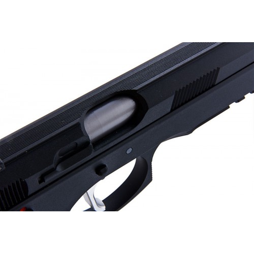 The replica was made of high-quality metal and polymer. It was made mainly of high-quality metal. The top of the slide features comfortable, adjustable iron sights with a fiber-optic front sight. The slide features characteristic notches that improve the replica’s ergonomics of use. A winged, double-sided safety is located in the rear part of the slide, within the range of a thumb. The pistol grip is laid with a special, anti-slip material.