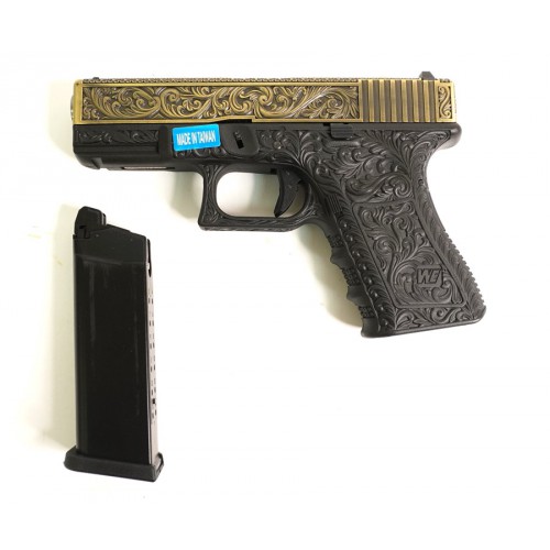 Страйкбольный пистолет WE Glock-19 Gen.3 Bronze, с гравировкой WE-G003BOX-FP