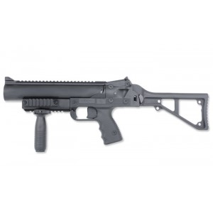 The B&T GL-06 is a fully licensed replica grenade launcher, originally made by the Brügger & Thomet, Switzerland. The stock and receiver are made of polymer and the barrel and front guard is metal. All four side rails are metal and will support any accessories imaginable. A quick-remove front grip is supplied to make the GL-06 complete. The GL-06 launcher takes any length airsoft grenade, which is a device that looks like a real world grenade, but uses a gas propellant to fire a variety of projectiles, like large amounts of 6 mm BB's. When inserted in a grenade launcher, and fired, it shoots all the BB's at once with a big blast, great for room clearing and suppressive fire.