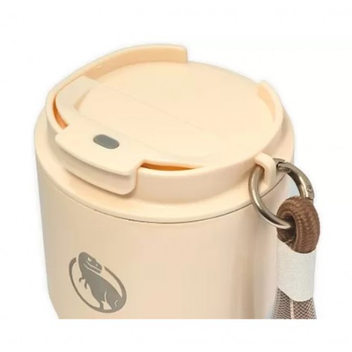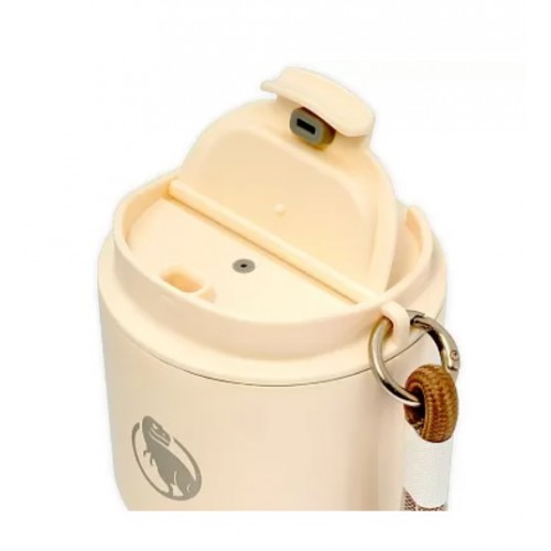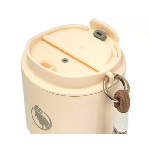 На крышке, с помощью круглого металлического карабина, закреплён прочный ремешок для ношения и подвеса. За счёт широкого горлышка термокружка проста в уходе – её легко мыть.