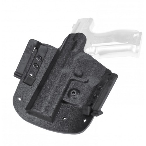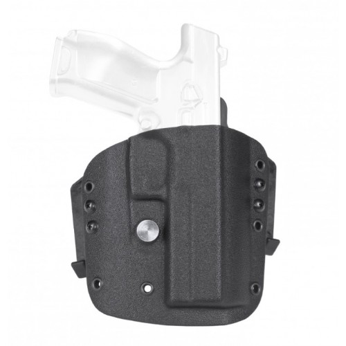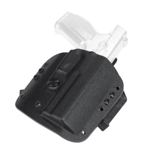 Выполнена из ABS пластика, имеет жесткую формовку и надежно фиксирует пистолет внутри. Степень удержания ,пистолета регулируется с помощью регулировочного болта. Таким образом, вы можете настроить кобуру для скоростного извлечения, а также для максимально крепкого удержания вашего оружия. Для ношения кобуры на поясе предусмотрено специальное крепление открытого типа. Благодаря своей форме позволяет быстро разместить оружие на ремне. Также, крепления позволяют разместить кобуру и на снаряжении с MOLLE (варбелт, набедренная панель) Находящиеся на разном уровне отверстия для установки крепления дают возможность регулировать угол наклона и высоту расположения кобуры. Благодаря низкому профилю кобуры, ваше оружие не будет слишком явно выделяться при ношении его под одеждой. Вес: 150 грамм