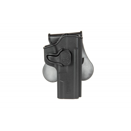 A pistol holster made of durable polymer by Amomax for replicas. It features an intuitive lock, released with an index finger when reaching for a gun.