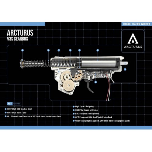 ARCTURUS K9T-CB FE™ (Feature Enhanced) AEG is latest version in 2024 with build-in ARCTURUS V3 FE™ ETU and V3 QD gearbox. ARCTURUS K9T-CB FE™ prominently features ZTAC style CNC aluminum handguard, charging handle, and adjustable folding stock. The handguard features BASIS mounting system for easy mounting of accessories. ARCTURUS K9T-CQ FE™ enables advanced ETU programable functions, and adjustable trigger travel via adjustable trigger stopper.