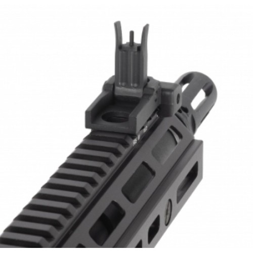 На автомате расположены механические прицельные приспособления, которые позволяют делать точные выстрелы. Целик и мушка съемные, поэтому их можно либо заменить, либо убрать совсем для использования оптических или коллиматорных прицелов. Низкопрофильная мушка не мешает устанавливать дополнительное навесное оборудование, поэтому ее можно не снимать.