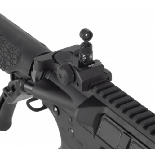 На крышке верхнего ресивера выполнена стандартная планка пикатинни, на которую можно установить практически любой коллиматорный или оптический прицел. Карабин имеет имитацию функции затворной задержки.