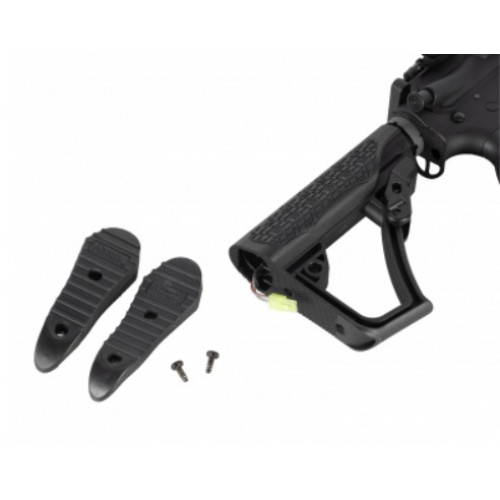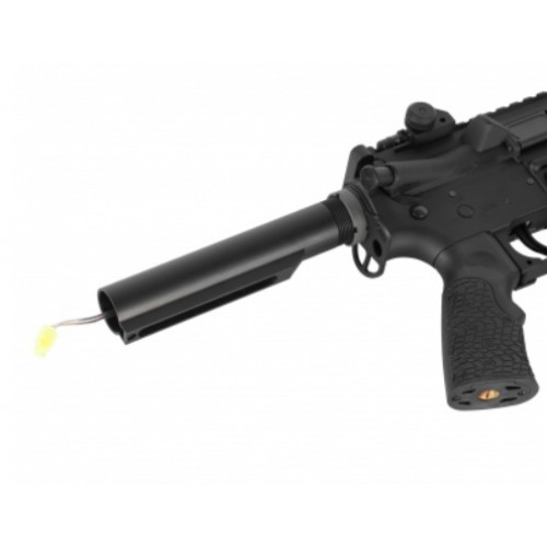 Приклад имеет двусоторнний порт для QD-антабки. Так же ремень можно закрепить на прикладе при помощи ременного обхвата, для этого предусмотрена петля для стропы ремня. Конструкция приклада позволяет закрепить ремень как для использования как правой, так и левой рукой, а также удобно транспортировать оружие, когда оно не используется в игровом процессе.