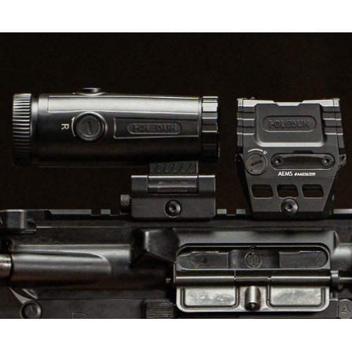 Magnifier for Flip-Up type collimator with 6x optical magnification from Holosun. Thanks to the fixed magnification, you can turn your collimator into a medium zoom scope. What distinguishes such a set from a spotting scope, however, is that, if necessary, it is enough to move the magnifier out of the way and a proper sight is available again.