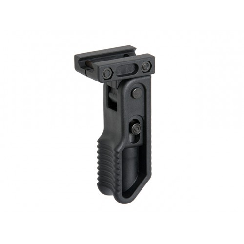 The front folding grip can be a switched from a vertical to a horizontal position by moving the double-sided switch.