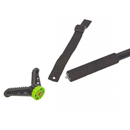Нога опоры изготовлена из прочного и лёгкого алюминиевого сплава и состоит из трёх секций. На ноге установлена неопреновая накладка для удобства удержания и нанесена шкала изменения высоты. Надёжные пластиковые клипсовые замки в закрытом виде практически не выступают за габариты опоры. Эргономичная форма замков позволяет открывать и закрывать их одной рукой. По сравнению с цанговыми замками, клипсовые – самый быстрый способ фиксации и визуальный контроль их закрытия.