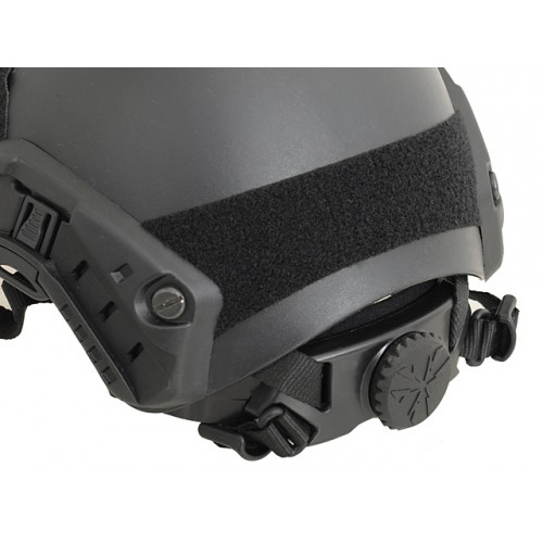 Helmet is equipped with two mounting rails, designed to hold special mount for tactical accessories such as tactical flashlights, hearing protection, etc. There is also mount for night vision goggles at front of the helmet. It have a velcro tapes allowing to attach team flags, moral pads, etc. Replica of ballistic helmet is equipped in size regulation (57-61 cm).