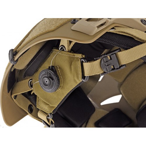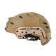 A replica of a lightweight polymer battle helmet providing protection against impacts and offering the installation of additional tactical modules and accessories. Equipped with comfort foam pads, size adjustment system, hook-and-loop fasteners for patches/markings/lighting, side rail kit, a shroud for night vision, cord kit and ventilation holes. Includes an additional two 2-slot Picatinny rails.